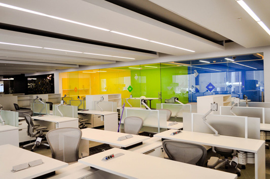 此案例裝修的色調(diào)很中性化,創(chuàng)造一個(gè)舒適的、現(xiàn)代的、環(huán)保的辦公環(huán)境。這樣才更契合它們的企業(yè)文化和品牌形象,體現(xiàn)企業(yè)的民主。它的主要特征幾乎全都在主辦公區(qū)得以體現(xiàn)。