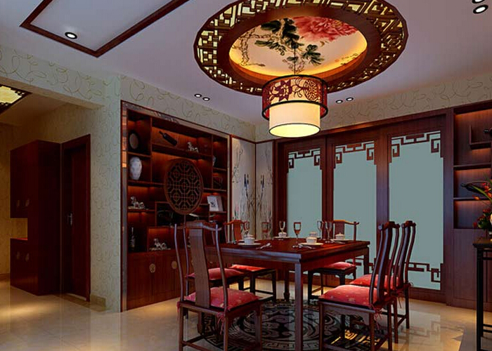 朱紅色的餐桌椅,配上精致的燈飾,使整個空間硬朗而又華麗、優(yōu)雅。餐廳的裝修又是木質(zhì)鏤空隔斷,大氣經(jīng)典。墻面的壁紙與吊燈都顯示出一種富麗堂皇的感覺。